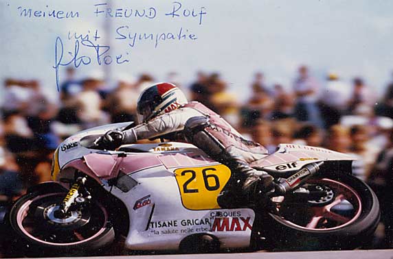 la sua moto (cerchi e carena) di Rosa venne così chiamato la Pantera Rosa. Di Lui tutti avevano un grande rispetto sia come uomo che come pilota. Di lui K. Roberts disse “ Ringraziate Dio che Guido non ha una moto ufficiale se no sarebbero stati cavoli amari per tutti” Si rivolse poi scherzosamente a Guido dicendo “Speriamo che resti povero”. |